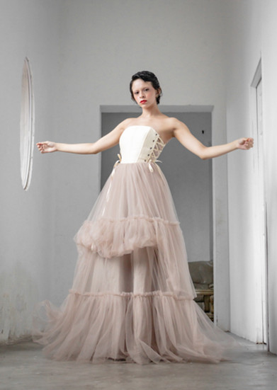 En contraste, Ledeny presenta una silueta casi imperceptible, una segunda piel que sugiere fragilidad con movimiento, hasta que el corsé de Marcela Posadas lo ciñe y lo transforma. La dulzura se disciplina. La feminidad se arma. La silueta deja de ser etérea para convertirse en subversión.