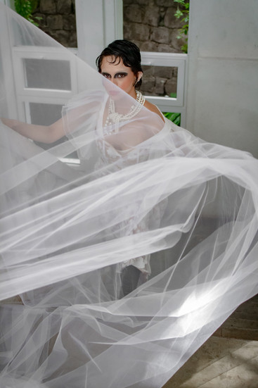 Las transparencias de Yanil Herrera flotan como un susurro peligroso. Tul que no cubre, sino que destaca la feminidad; una falda exagerada que se expande como una nube consciente de su tamaño y un torso de pliegues etéreos que se rinden sobre un solo hombro, como una caricia desordenada en la que destacan destellos de sutileza. Es fragilidad con intención, suavidad que evoca fascinación.