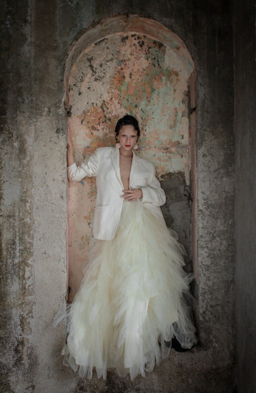 Andrea Zúniga introduce una ruptura conceptual: el blanco como vehículo de oscuridad. Inspirada en una feminidad que se transforma sin perder elegancia, su pieza demuestra que el dramatismo no necesita exceso cromático para ser inquietante y para transmitir tenebrosidad.
